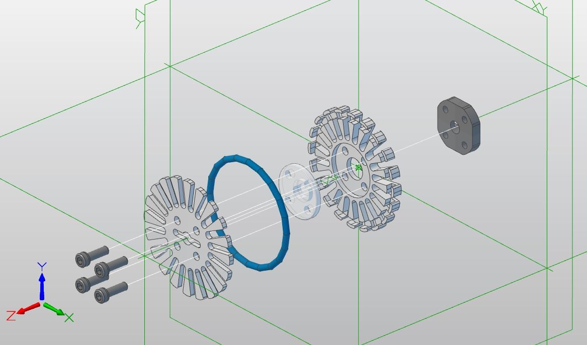 サイドホイール20個は省略してあります。青いリングはサイドホイールの軸を示しています。実際にはリングではなく、ピン単体が20個入っているので、それらを溝に埋め込んでリング化します。
